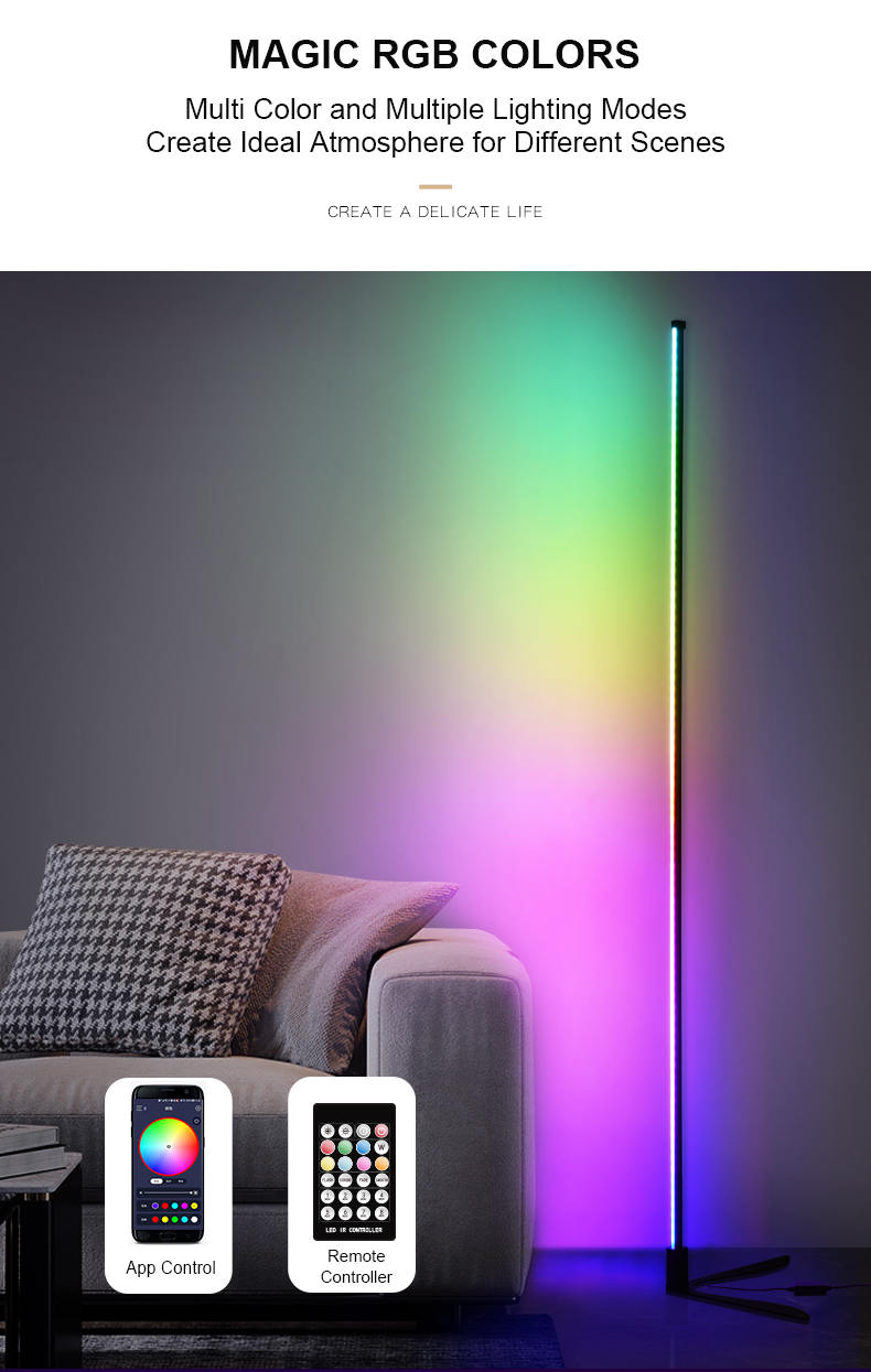 The corner LED floor lamp has upgrade RGB LED strip that various of colors can be chasing in a line, shows a rainbow-like color. It is a great mood light to create the ideal ambience, providing dynamic and vibrant light for living room, bedroom, gaming room, office, etc.