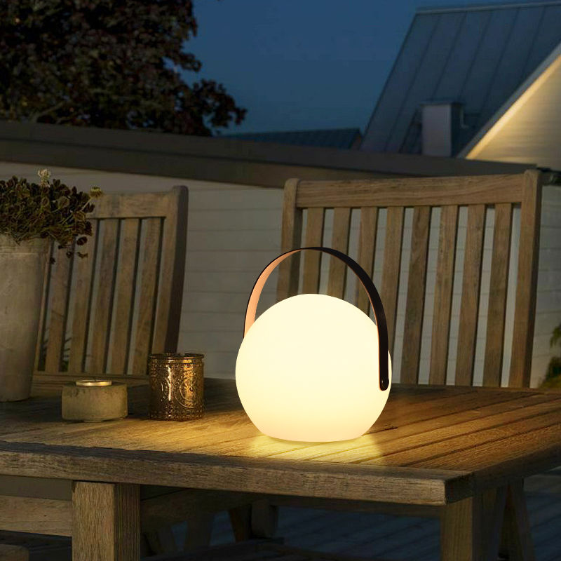 Made of sturdy, weatherproof polyethylene and showing cordless and rechargeable design, this modern spherical shape cordless lantern table lamp is particularly suited to outdoor spaces, like the patio, gardens, even for the camping adventure. The smooth handle makes it easy to transport and even to hang from the branch of a tree. Thus, these modern table lamps are both practical and versatile.